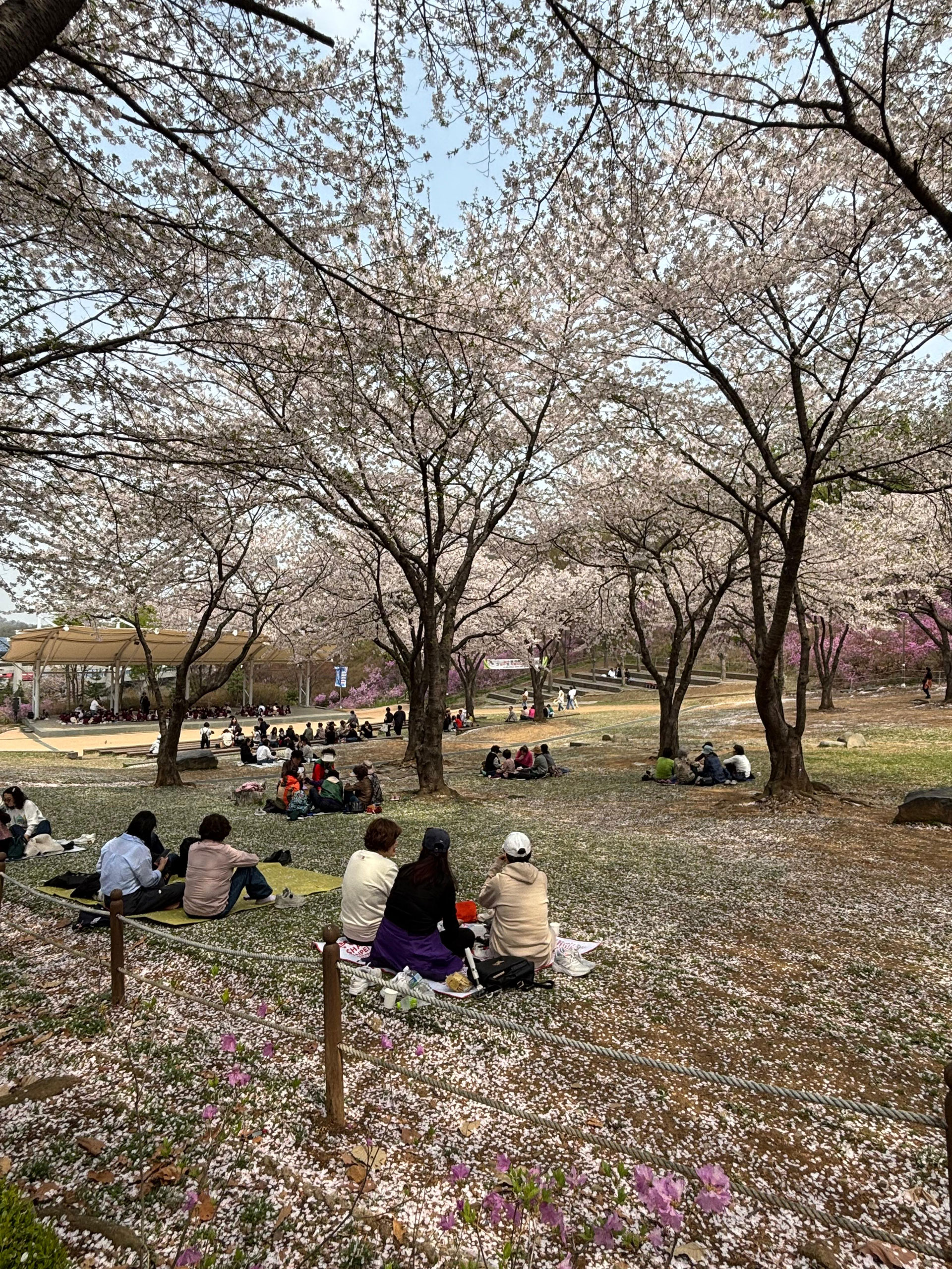 El sitio que MÁS me gustó fue Jindallae Dongsan (진달래 동산), un lugar hermoso, vibrante, inundado de sonrisas, donde las amistades intercambian historias por carcajadas mientras saborean rollitos de Kimbab (김밥). Por esa época del año, gozaba de una suave brisa hacía que los pétalos de las flores de cerezo cayeran como copos de nieve.de de ti.